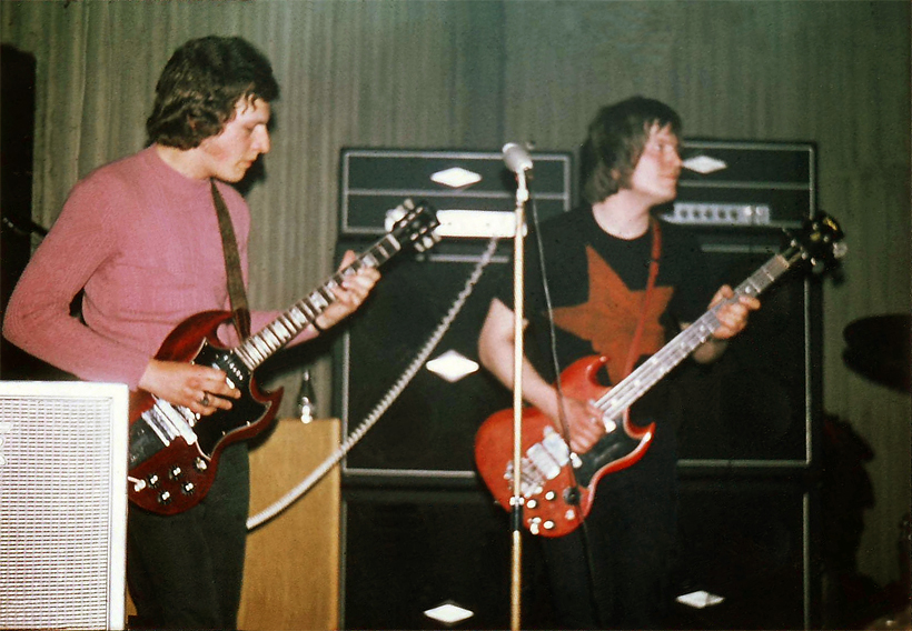 Leider etwas unscharf, das Foto. Man beachte die synchrone Gitarren-Schräglage der beiden Solisten. Der Bassist ist ganz beseelt. Ob das an der Location lag? Schließlich war es ein Auftritt im Gemeindehaus der Christuskirche.