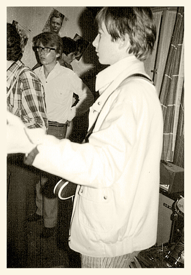 Von links nach rechts: Pee Bee (im Anschnitt), Kurt Lewwe, der Typ mit Brille hat zwar kein Instrument gespielt, war aber auch aus unserer Schulklasse und als so eine Art Roadie dabei. Helmut Schrader (ganz hinten) und Karsten Niebers (ganz vorne). Dahinter eine Echolette ET 100 Lautsprecher-Box mit Hohner Orgaphon- Verstärker. |