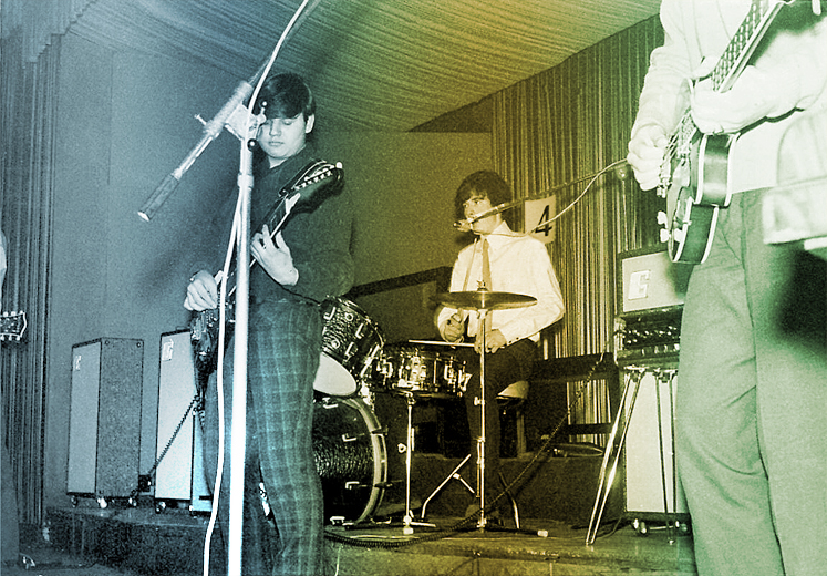 Dieses Bild zeigt an der Arbiter-Gitarre: Wolfgang Müller; am Trixon-Schlagzeug: PeeBee; am Höfner Club-Bass: Edward (Eddie) Chlust (jedenfalls seine Hose und sein Bass).