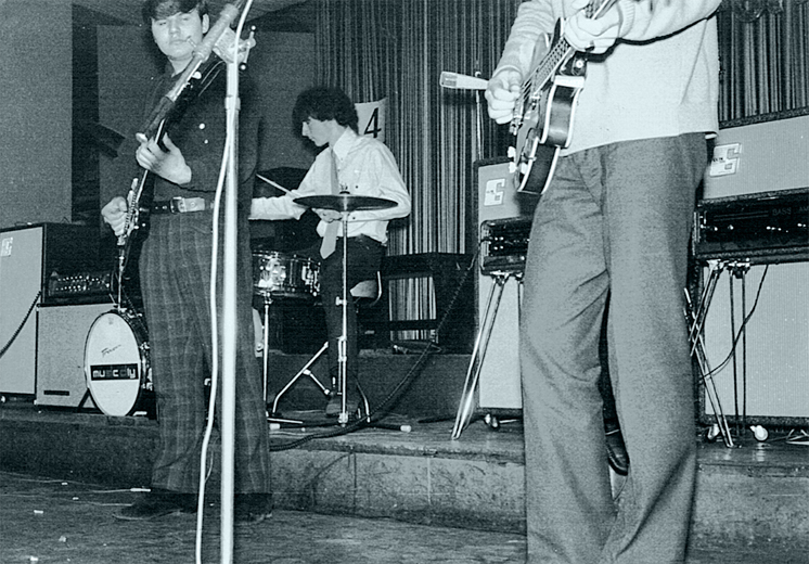 Hier bin ich auch mal zu sehen: PeeBee am Schlagzeug. Das Hemd war gelb und die Krawatte rot. Links: Der furchteinflößende Blick von Wolfgang und rechts wieder Eddies Hose und sein Club 60 - Bass.
